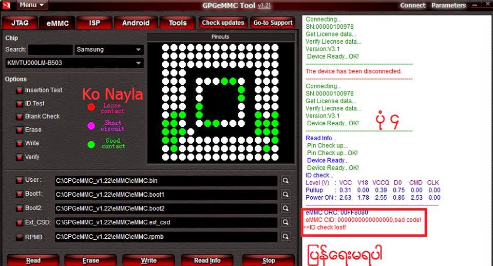 ရေအာင္ေနာ္ အရင္ဆံုးျပန္ေရးမဲ့အိုင္စီကို ခဲျပန္ေဖာ္ျပီး GPGEMMC Box ရဲ႕ IC ထဲ့တဲ့ ပံုစံခြက္ထဲ မွာ ထည့္ပါ ( ပံု-၀.၁ ) Box နဲ႔ PC ကို ခ်ိတ္ျပီး PC ကေန ေဒါင္းထားတဲ့ အထဲက GPGeMMC_v1.22 >> GPGeMMC.exe ကို run ရပါမယ္